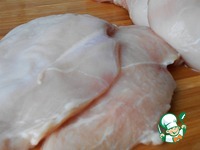 Куриное филе вымыть, обсушить и разрезать вдоль на 2 пласта (а если филе особо крупное, то и на 3). |