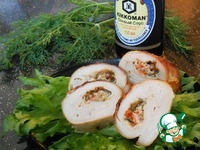 На филе выложить начинку, скрутить рулетиком. Уложить куриные рулетики в форму, смазанную маслом. Запекать в духовке при 180 гр 30 мин, периодически поливая выделившимся соком. |