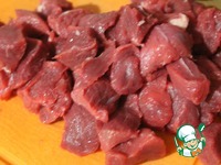 В казане разогреваем растительное масло. Мясо нарубаем кусочками размером с грецкий орех. |