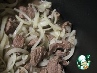 Обжариваем мясо в казане в течение 10 минут, добавляем нарезанный полукольцами лук. Обжарим все вместе, чтобы лук стал мягким. |