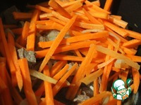 Морковь режем соломкой, добавляем к мясу. Перемешиваем и посолим. Потомим немного все вместе. |