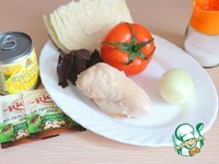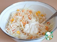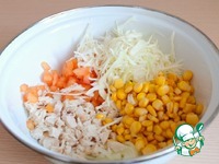 В миске соединить порезанное куриное филе, репчатый лук, консервированную кукурузу, помидоры, нашинкованную соломкой капусту. |