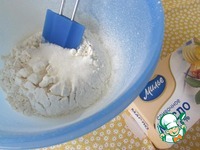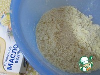 В мучную смесь добавить холодное сливочное масло, которое предварительно порезать на небольшие кусочки. |