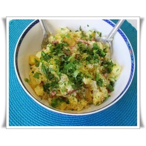 Описание: Замечательный салат! Картофельные салаты, вообще очень вкусные, а в этом салате удачно сочетаются и мягкая картошка, и чуть похрустывающая капуста, и ароматная обжаренная копченая грудинка, и легкая кислинка и острота соуса. Сытная горячая закуска или полноценное горячее блюдо к ужину, или в качестве легкого обеда.