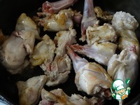 Кролика осмолить, помыть, обсушить бумажным полотенцем и разделить на части. Для супа я взяла небольшие кусочки. На сковороде нагреть 2 ст. л. оливкового масла и обжарить кролика до легкой корочки. |