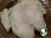 Курочку я отварила заранее. У меня грудка в этот раз, но если вы возьмете всю курочку и используете разное мясо - будет сочнее! |