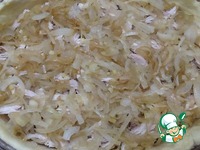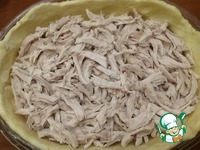 Слоями выкладываем начинку. Сначала разобранную на волокна курочку. |