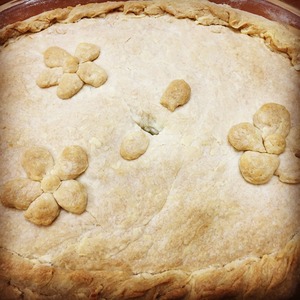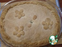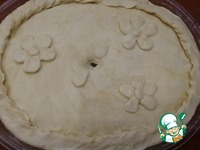 Раскатываем меньший кусочек теста и накрываем нашу начинку. В середине делаем дырочку для выхода воздуха. При желании украшаем цветочками или другими узорами. |