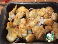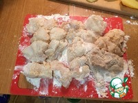 Рыбу нарезать средними кусками, посолить, поперчить и обвалять в муке. |