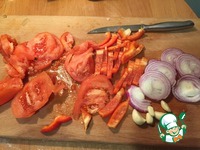 Лук и помидор нарезать кольцам, болгарский перец -- брусочками. |