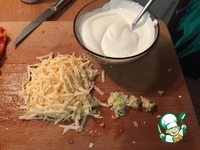 Сметану соединить с майонезом, посолить, поперчить, добавить пропущенный через чеснокодавилку чеснок, натёртый на тёрке сыр и тщательно перемешать. |