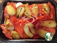 Смазать соусом слой рыбы и продолжить выкладывать слои: помидоры с перцем, картофель и сверху ещё раз смазать соусом. |