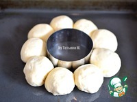 Сформированные булочки выкладывать на смазанный маслом противень вокруг подходящего кольца (или формы) для того, чтобы серединка булочек была свободна для соусника. |