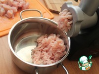 Куриное филе вымыть, нарезать и пропустить через мясорубку. |