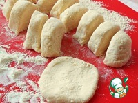 Разделить тесто на одинаковые кусочки, у меня получилось 12 штук. Скалку пачкать не будем, вполне можно обойтись без неё. Руками сформировать "лепешечки". |