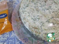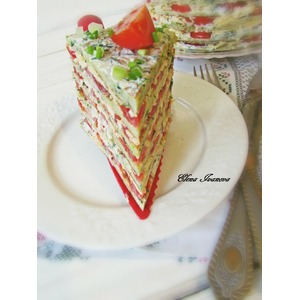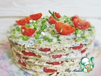 Освободить торт от бортика формы и украсить по своему желанию. Я украсила зеленым луком и помидорками-черри. |