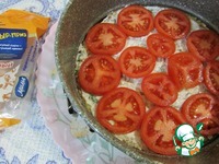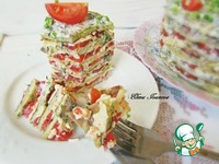 Помидоры присыпать сыром. Слои повторять. Последний корж - кабачковый блинчик, смазанный сметанным соусом. |