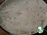На сковороду добавить растительное масло и обжарить порезанный полукольцами лук, затем лук выкинуть, а масло вылить в дайкон. |