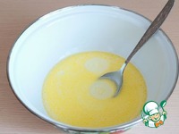 В миску с подогретым молоком добавить расплавленное сливочное масло (50 гр.), сахар (2 ст. ложки). |