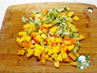 Фрукты очистить и нарезать на небольшой кубик. Я еще использовала замороженную ежевику которую предварительно разморозила. |