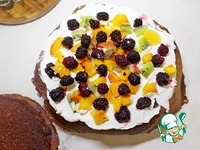 Сверху обильно смазать оставшимся кремом и посыпаем оставшимися фруктами. |