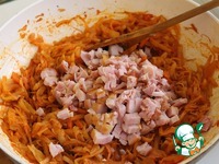 В конце добавить копченый окорочок, нарезанный мелкими кубиками, перемешать и потомить все вместе 1 минуту. Выключить огонь и остудить начинку. |