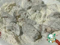 В муку добавляем соль и панируем каждый кусочек отдельно. |