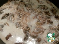 К луку выкладываем печень. Сметану разводим водой и заливаем в сковороду. Добавляем перец, соль по вкусу и тушим на небольшом огне ещё 5 минут. В конце выдавливаем чеснок. Все готово. |