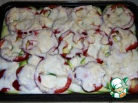 Кабачок тонко нарезают с кожурой и выкладывают поверх помидоров. |