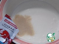 Кефир подогреть до тёплого состояния. Добавить соль, сахар и дрожжи. Перемешать. |