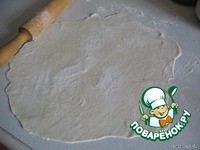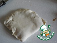 Затем формируем из начинённой четвертинки круглую лепёшку и раскатываем ещё раз. Вот у меня немного разорвалась. Надо раскатывать очень осторожно и стараться посильнее слеплять края. |