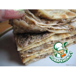 Каждую готовую лепешку разрезать на 4 части. Получится вот так. Мясо внутри получается таким вот слоем. |