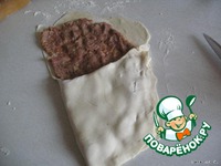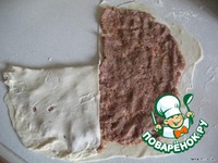 Дальше идёт самое интересное: мысленно делим лепёшку на 4 части, 3/4 покрываем фаршем. |