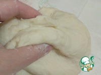 Далее насыпаете постепенно 500 гр муки и вымешиваете ложкой. Как только стало тяжело мешать ложкой, добавляете масло и вымешиваете руками. Тесто не будет прилипать к рукам, присыпать мукой не нужно.
