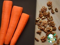 Морковь натереть на мелкой терке. Орехи порубить ножом (я их истолкла в ступке). |