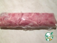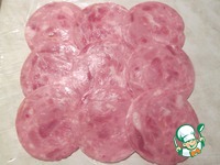 Ломтики ветчины выкладываем внахлест на пищевой пленке, формируя квадрат. |