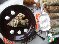 На блинчики выкладывать небольшое количество начинки, свернуть трубочкой и подавать со сметаной. |