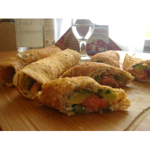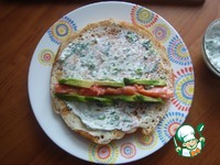 Рыбу нарезала полосками. Авокадо почистила и сбрызнула лимонным соком. Тоже нарезала длинными полосками. Блин обмазала риккотой с зеленью и выложила рыбу и авокадо вот таким способом. |