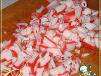 Крабовые палочки нарезать поперек, я аккуратно разбираю колечки на полосочки (типа лапши получается). |