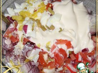 Накрошить лук мелко, можно обдать кипятком, добавить в салат, заправить майонезом. |