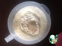 Добавить подогретое молоко, тёплую воду, дрожжи, муку, 70 мл растительного масла. Хорошо перемешать до однородной массы. |