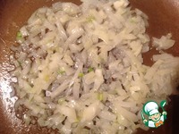 Сковороду поставить на огонь, добавить половину сливочного масла. Как только масло расплавится, добавить лук и обжарить на небольшом огне 5 минут, не допуская зажаривания. |