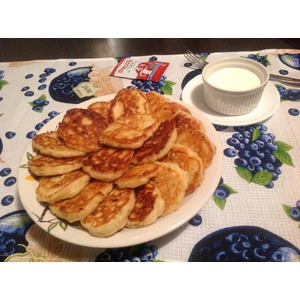 Готовые оладьи немедленно подать к столу. Очень вкусно с холодной сметаной. Приятного аппетита! |