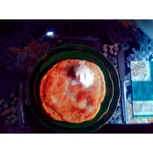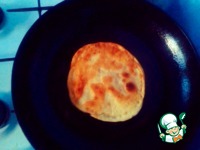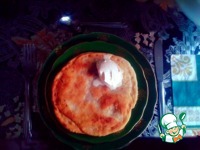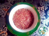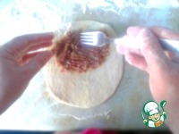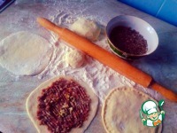 Раскатываем тесто, диаметром приблизительно 13 см, и выкладываем фарш на получившийся пласт. |