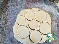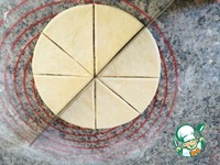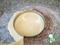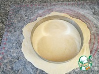 Припылите стол мукой и раскатайте тесто в круг диаметра 22- 23 см толщиной 4 - 6 мм. Творожное тесто будет вкуснее в более тонком слое теста, чем в толстом.