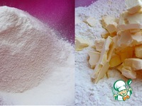 В чашку для замеса теста просеить муку с разрыхлителем, нарезать маргарин. |