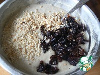 В это время замочить чернослив в горячем кофе минут на 20, затем мелко нарезать, жареные орехи также измельчить. Вмешать в тесто |