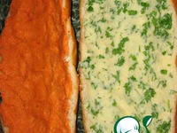 Разделить это "тесто" на две части, в одну добавить пасту, а в другую мелко нарезанную зелень. |