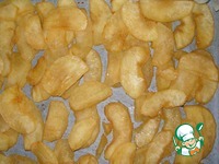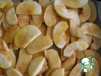 Яблоки почистить, нарезать тонкими дольками. Противень застелить бумагой для выпечки. Выложить дольки, посыпать их сахаром и полить маслом. |