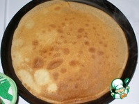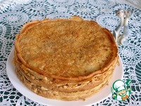 Повторяем слои насколько хватит начинки. У меня получается 5-6 слоёв. Последний слой начинки накрываем блином, посыпаем его сахаром и поливаем сливочным маслом. |